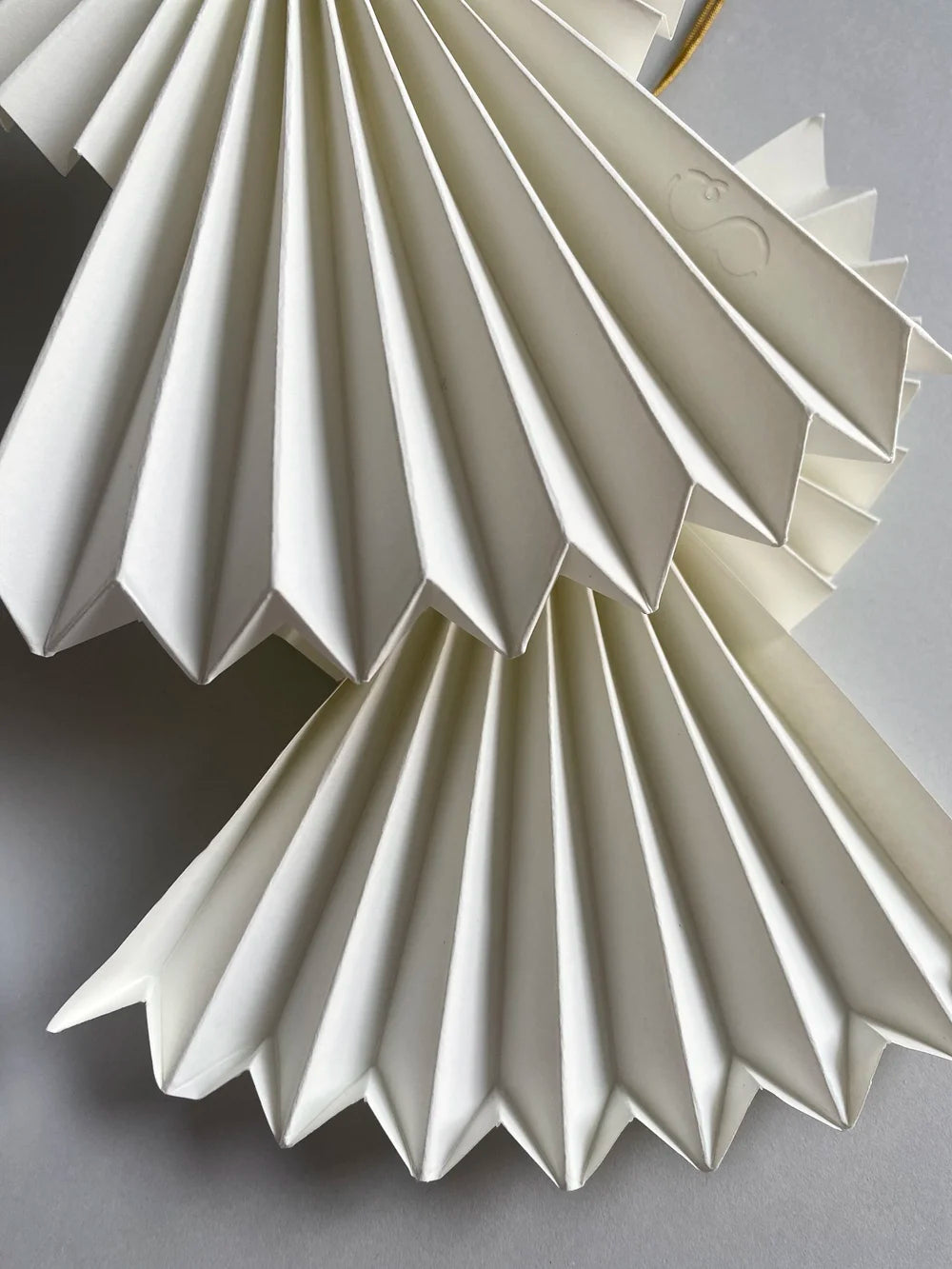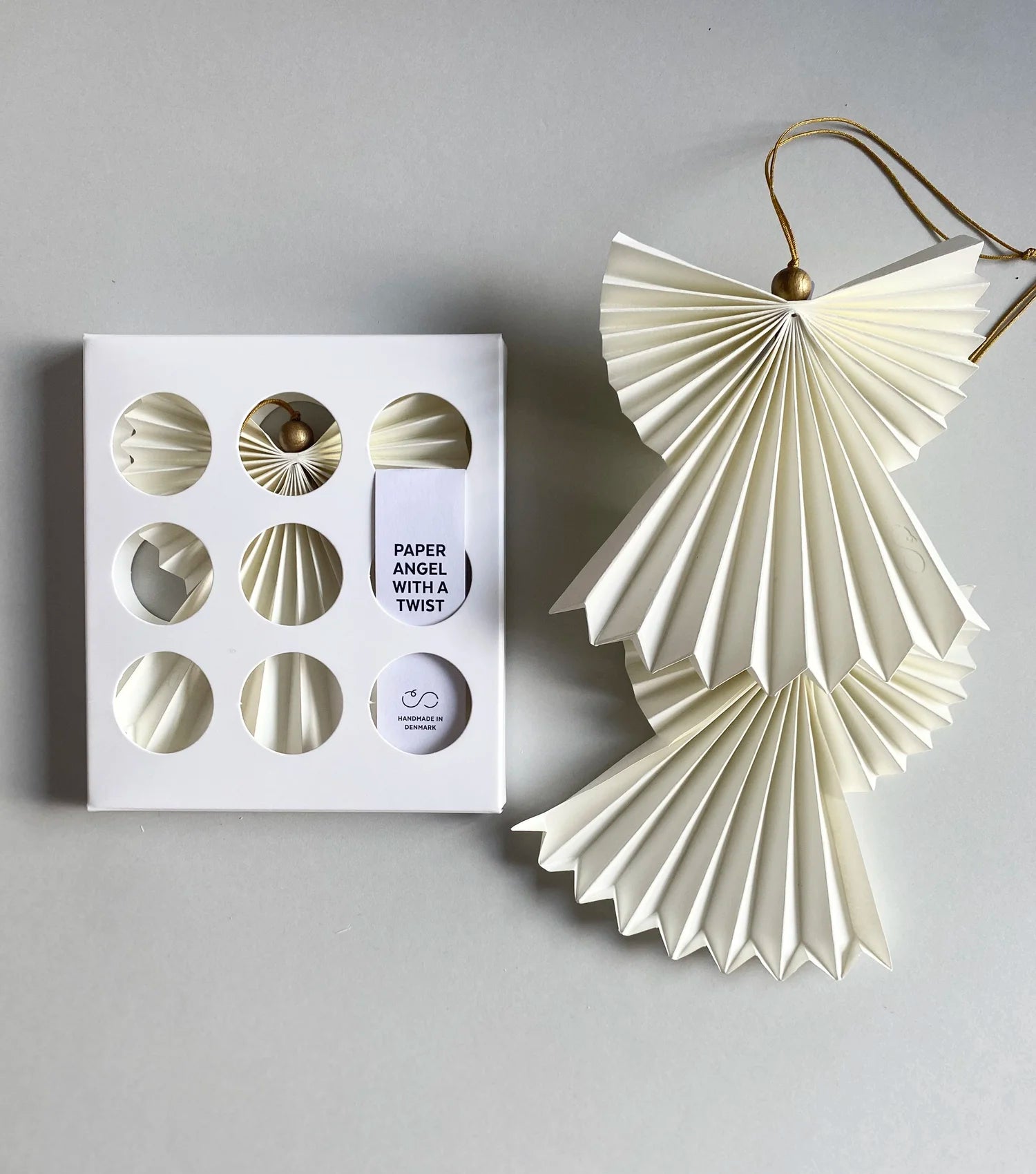 Charlotte Søeborg Ohlsen har designet en engel foldet ud af papir. Englen har en fin forgyldt træperle som hoved.