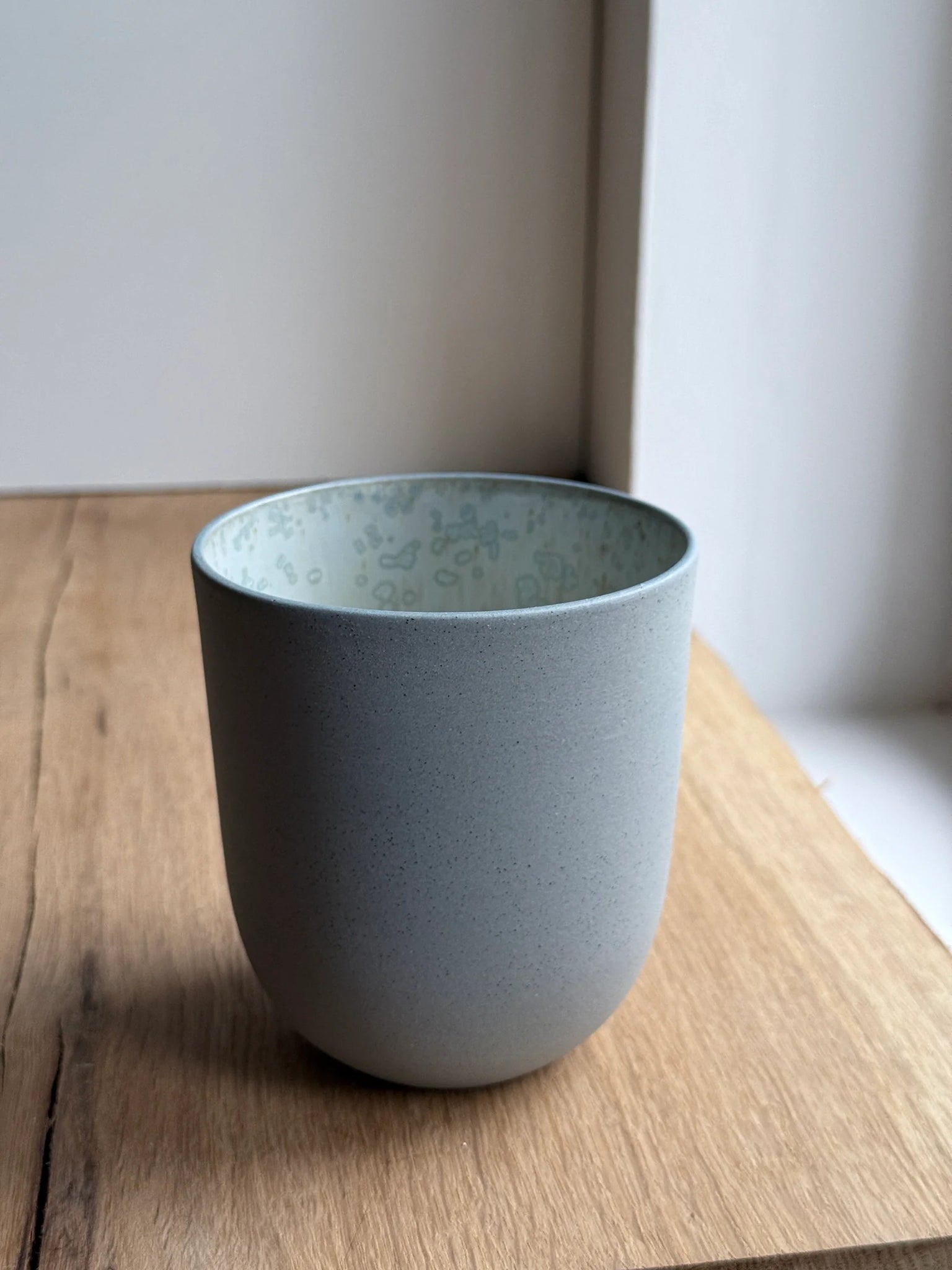 Koppen er lavet i indfarvet stentøj. Efter den første brænding er koppen glaseret på indersiden med en krystal glasur og vandslebet på ydersiden, så overfladen er blød og rar at røre ved.