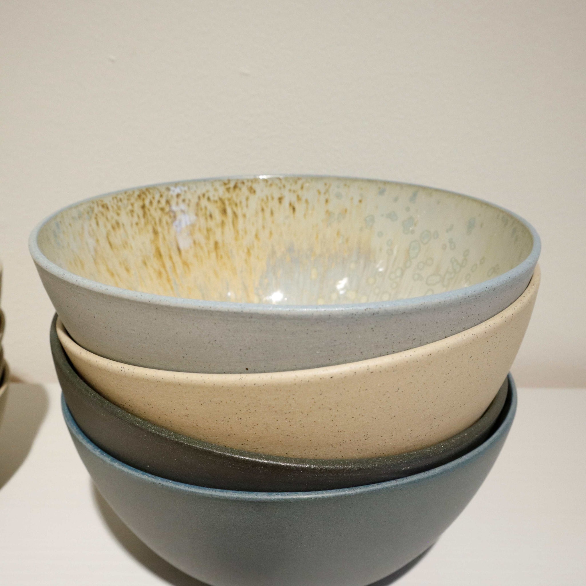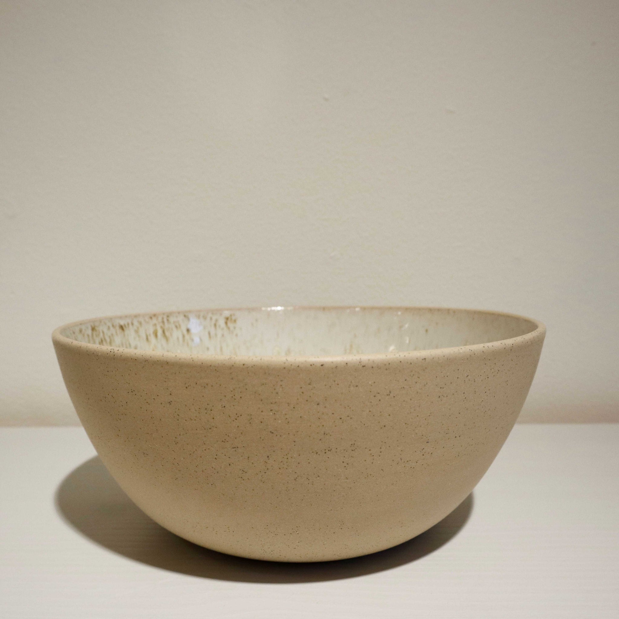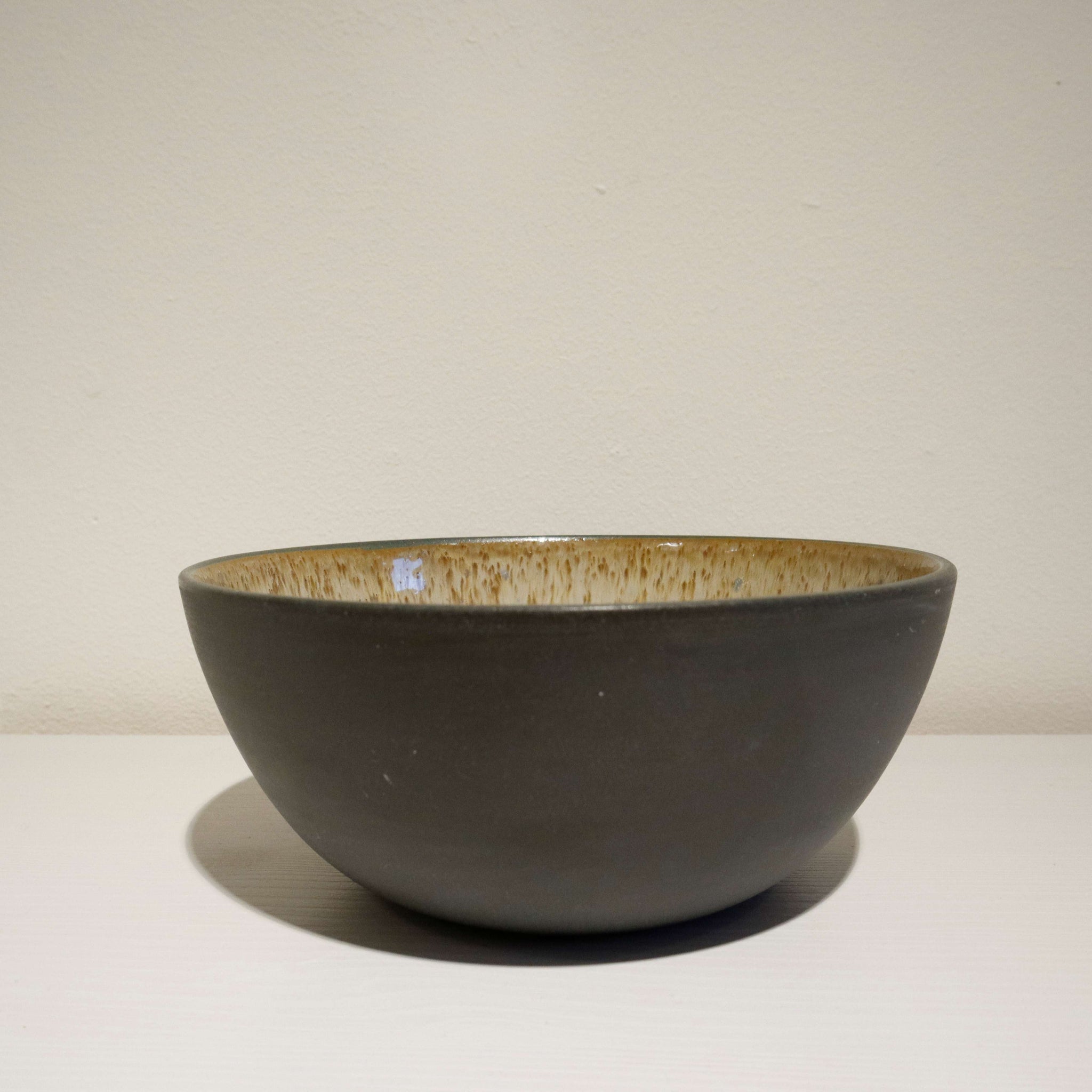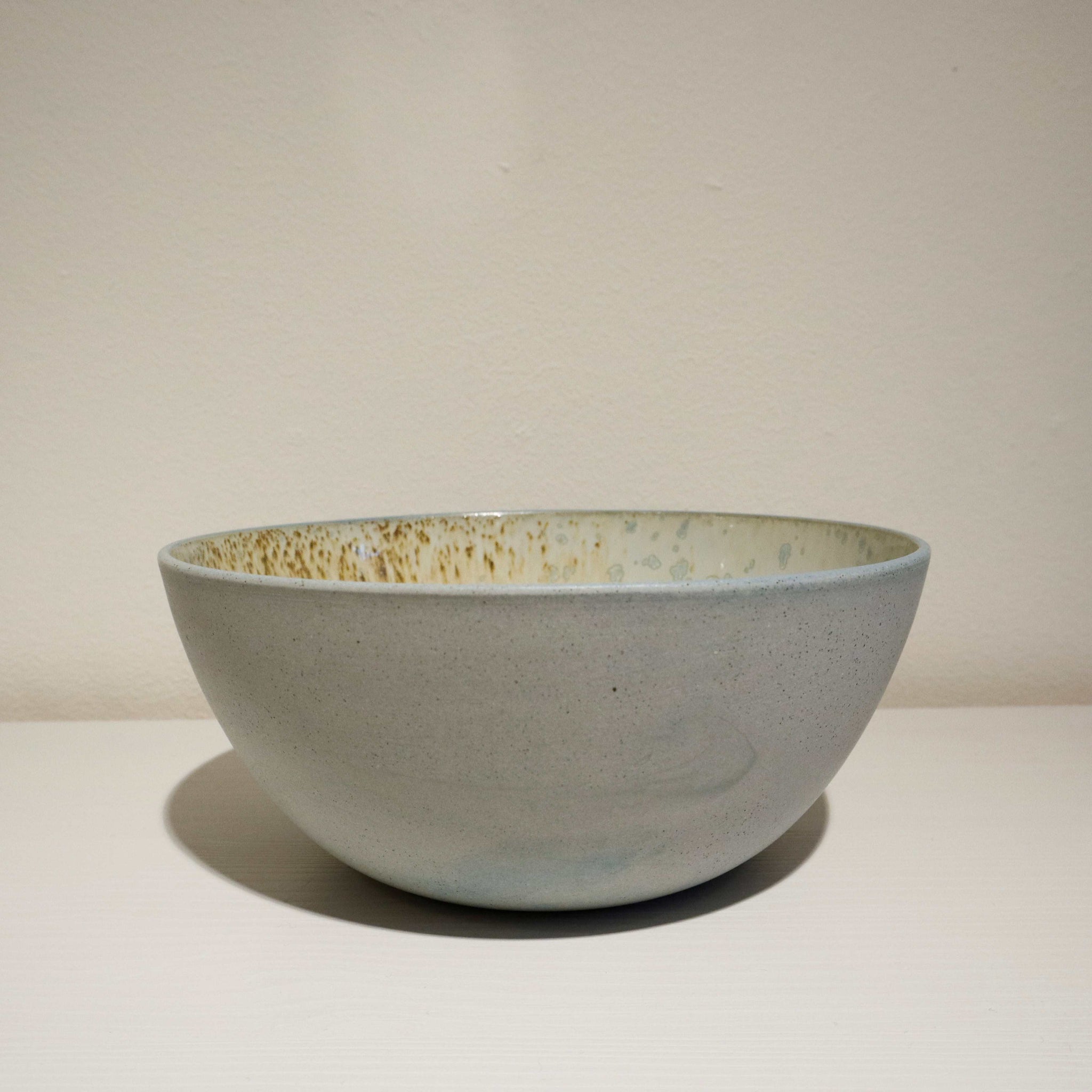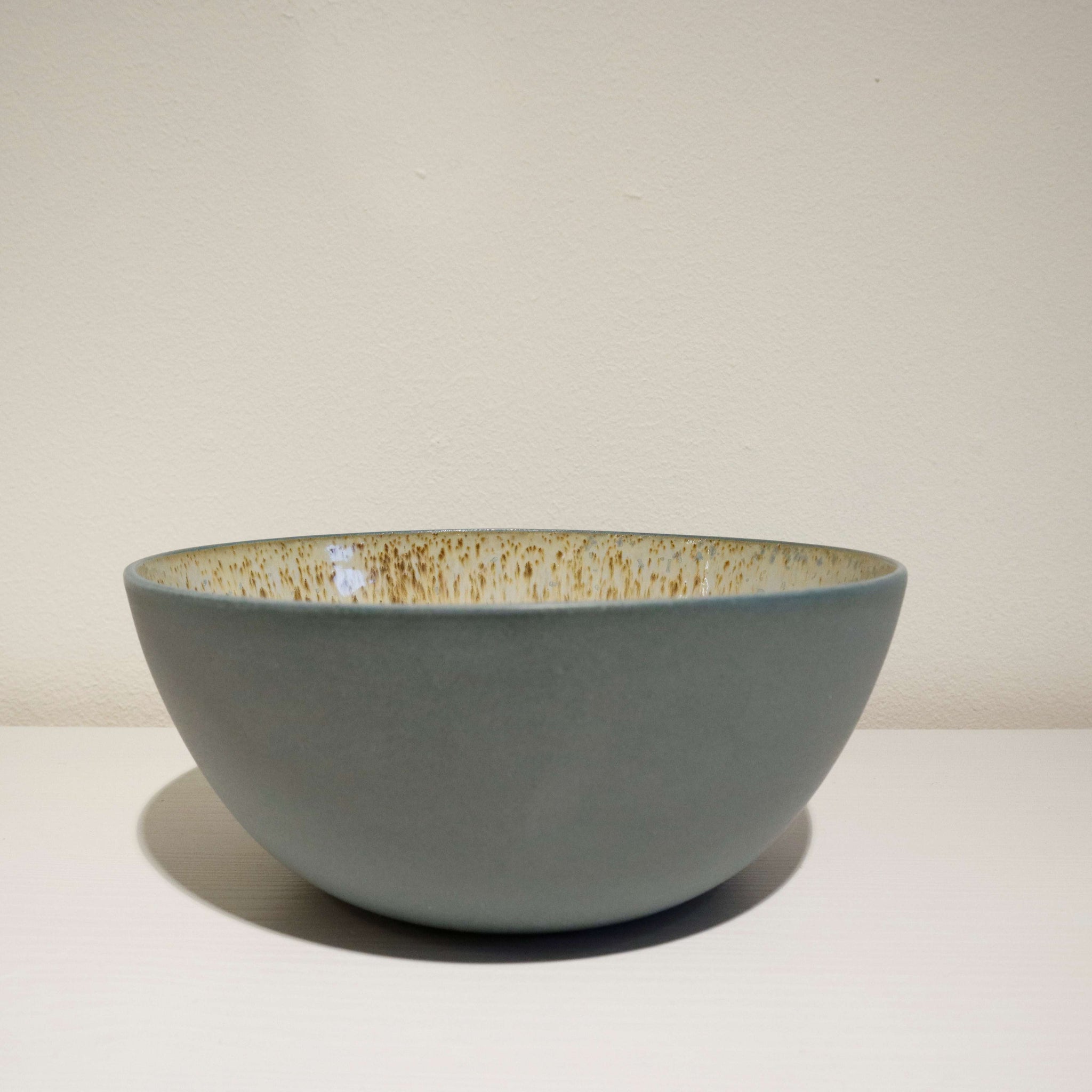 Skålen er støbt i indfarvet stentøj. Efter den første brænding er skålen glaseret på indersiden med krystal glasur og efterfølgende vandslebet på ydersiden så den er blød og rar at røre ved.